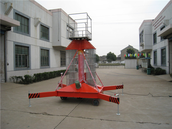 套缸式高空作業臺為多級液壓缸直立上升,液壓缸高強度的材質和良好的機械性能,塔形梯狀護架,使升降平臺有更高的穩定性。